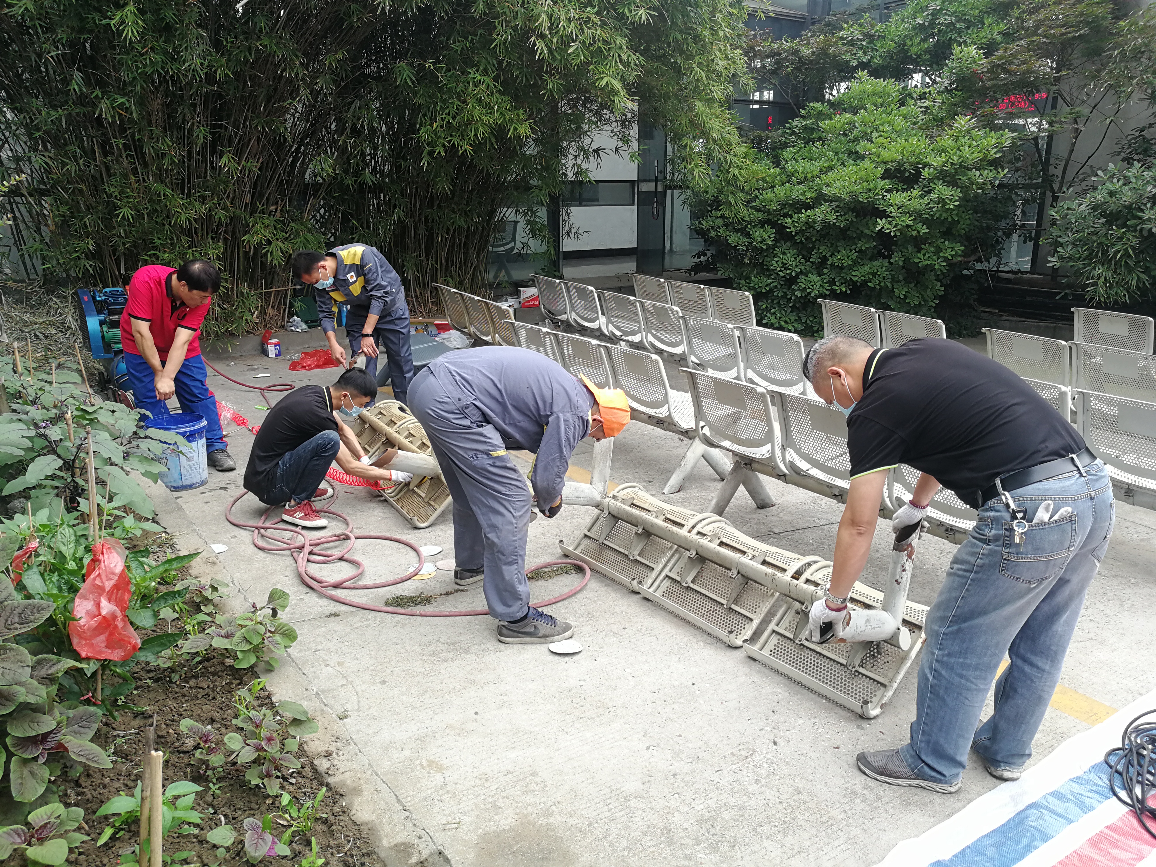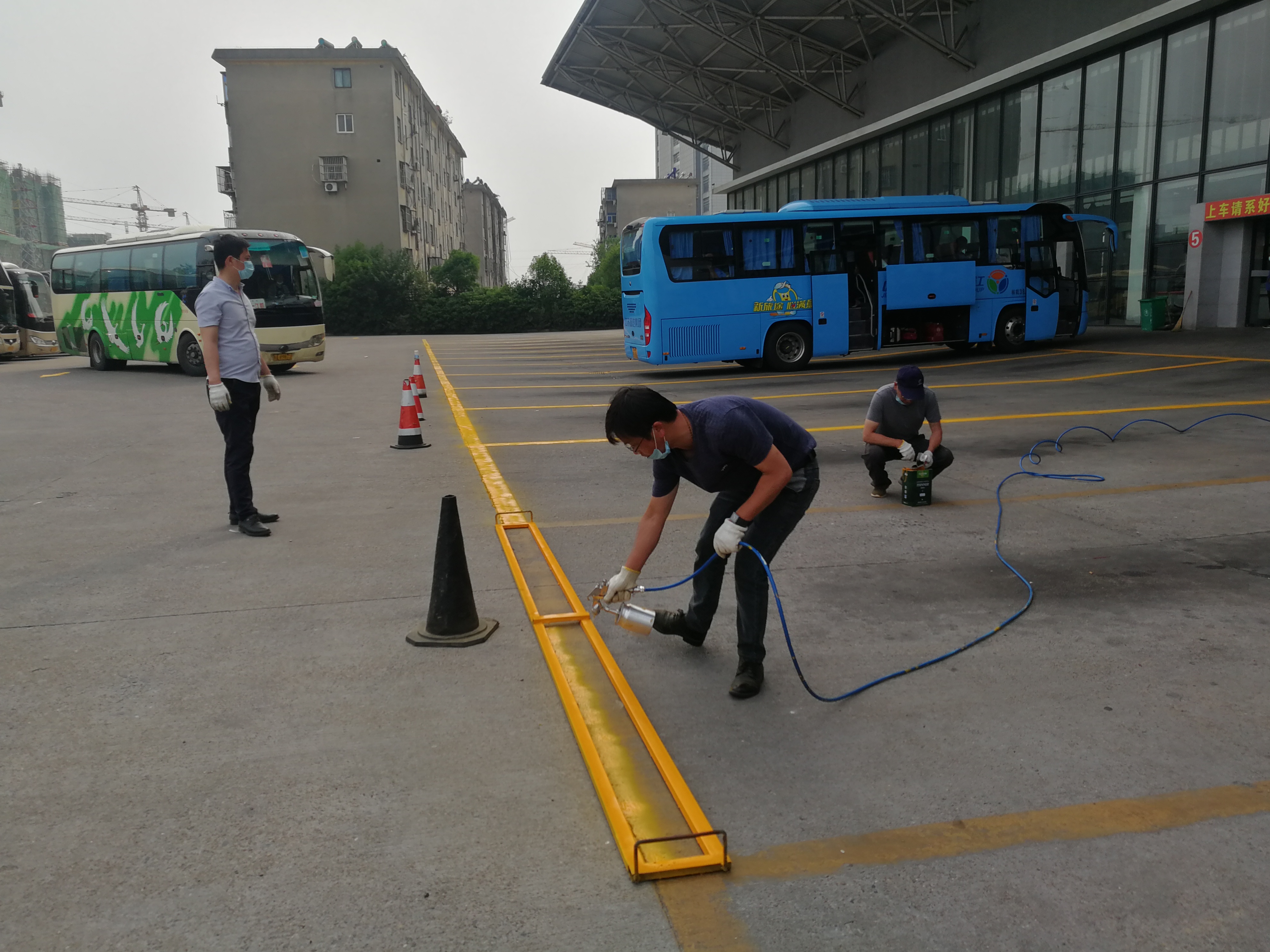 修理廠在接到江都分公司的任務(wù)請援,指派江都維修點,抽調(diào)總廠黨員骨干成立12人的突擊隊執(zhí)行這項任務(wù)。5月31日至6月1日兩天,從早上7點到晚上7點,突擊隊按照計劃分工明確,分成兩支隊伍同時進行,江都維修點負責座椅搬運、打磨、水洗、噴漆、歸位等系列工作,修理總廠負責車輛通道設(shè)計、標識、噴字以及停車位劃線任務(wù)。
