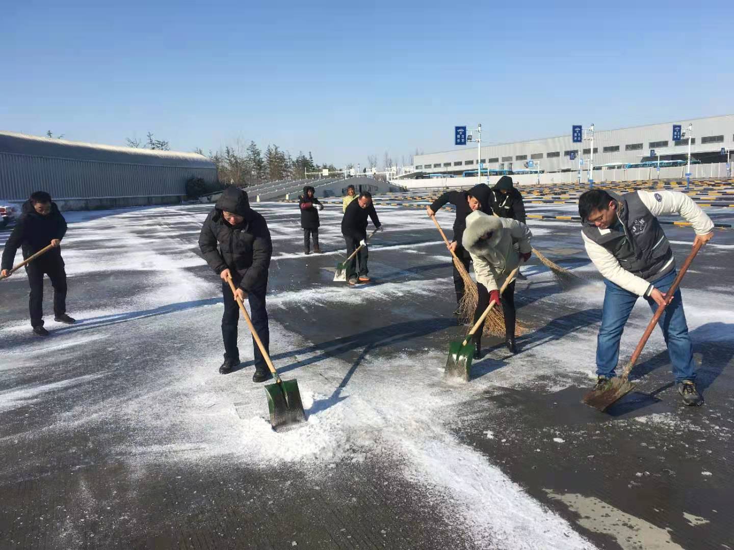 12月30日早上各黨支部積極響應(yīng)集團(tuán)黨委號召,組織黨員干部、管理人員協(xié)助車站清理積雪,在站前廣場、發(fā)車平臺,進(jìn)出站口等重點部位,大家拿著掃把、草墊、鐵鍬、雪鏟,充分發(fā)揮團(tuán)隊協(xié)作精神,干勁十足,一派熱火朝天景象,為班線開通做好后勤保障。