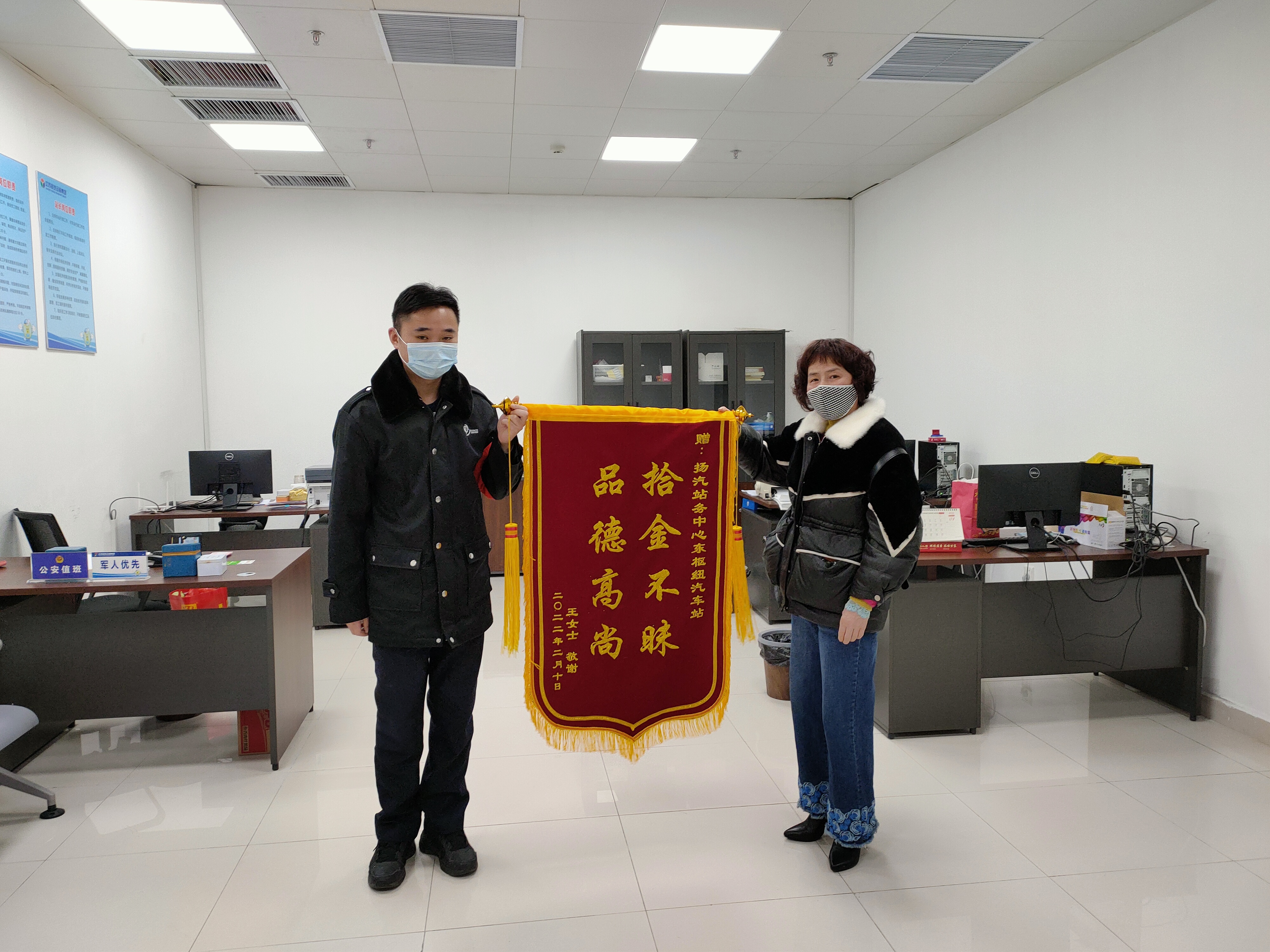 2月8日下午18:00,揚(yáng)州東樞紐汽車站至泰州南站最后一班車即將發(fā)車,臨近發(fā)車點(diǎn),一名旅客匆匆在售票處購票后帶著行李上二樓乘車,此時(shí)值班員姜衛(wèi)軍突然接到服務(wù)臺電話,售票員李玲說道,剛才有名旅客為了趕泰州班車,錢包落在了售票臺上。姜衛(wèi)軍隨即趕到現(xiàn)場,經(jīng)問詢,該班車已準(zhǔn)點(diǎn)駛出車站,在與駐站民警溝通后,確認(rèn)錢包內(nèi)裝有3000元現(xiàn)金、社?般y行卡若干,為消除旅客的焦慮情緒,姜衛(wèi)軍也是第一時(shí)間與王女士取得聯(lián)系。