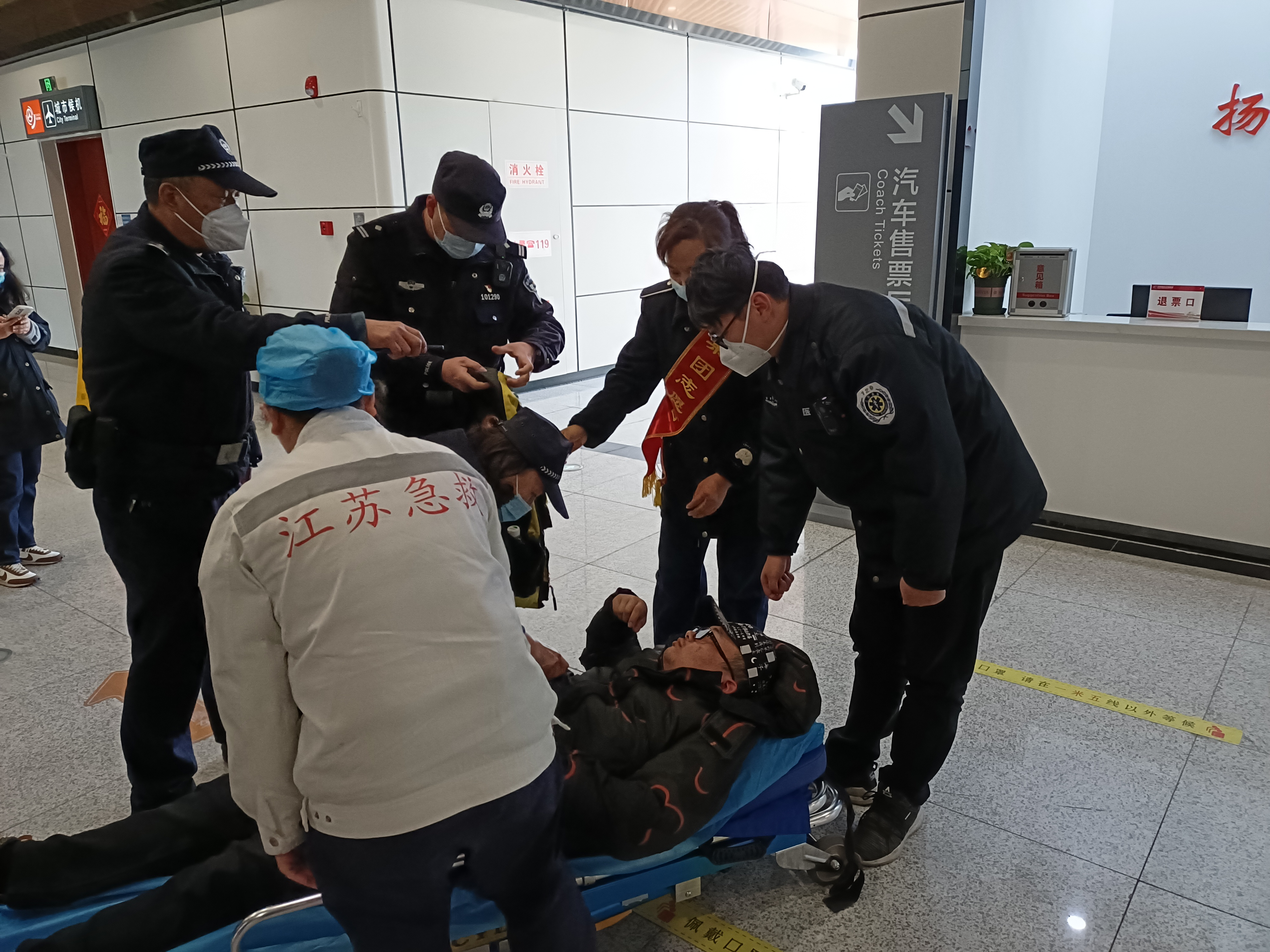 2月16日下午,揚州東樞紐汽車站售票處,一名正在購票的旅客突發(fā)癲癇,暈倒在地,現場工作人員及志愿者立即進行了救助。