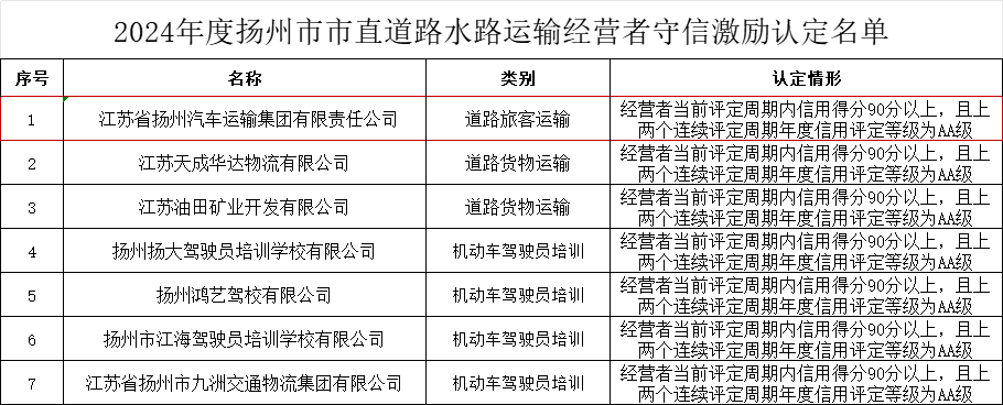 揚汽集團獲2024年度揚州市市直道路運輸經(jīng)營者守信激勵名單認定